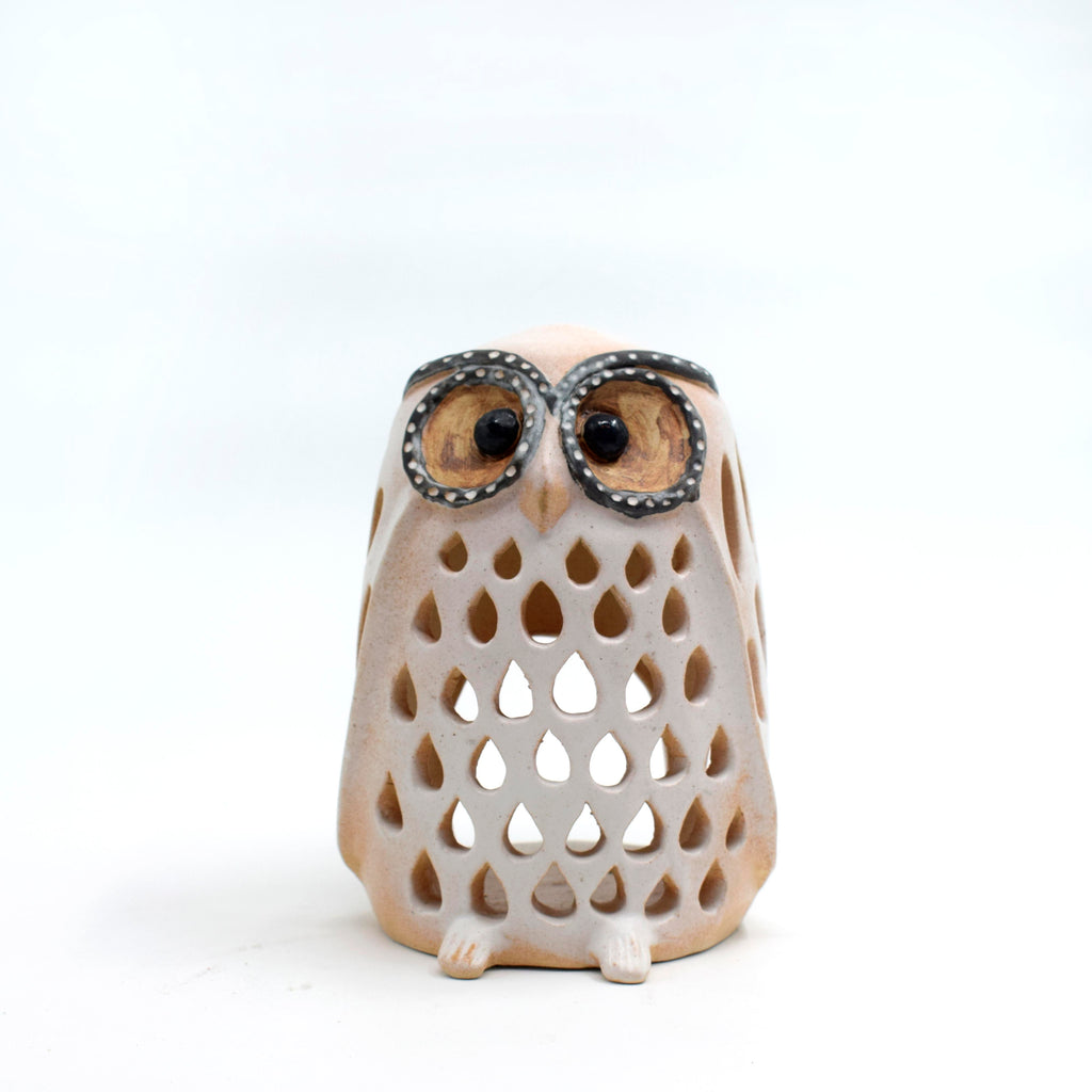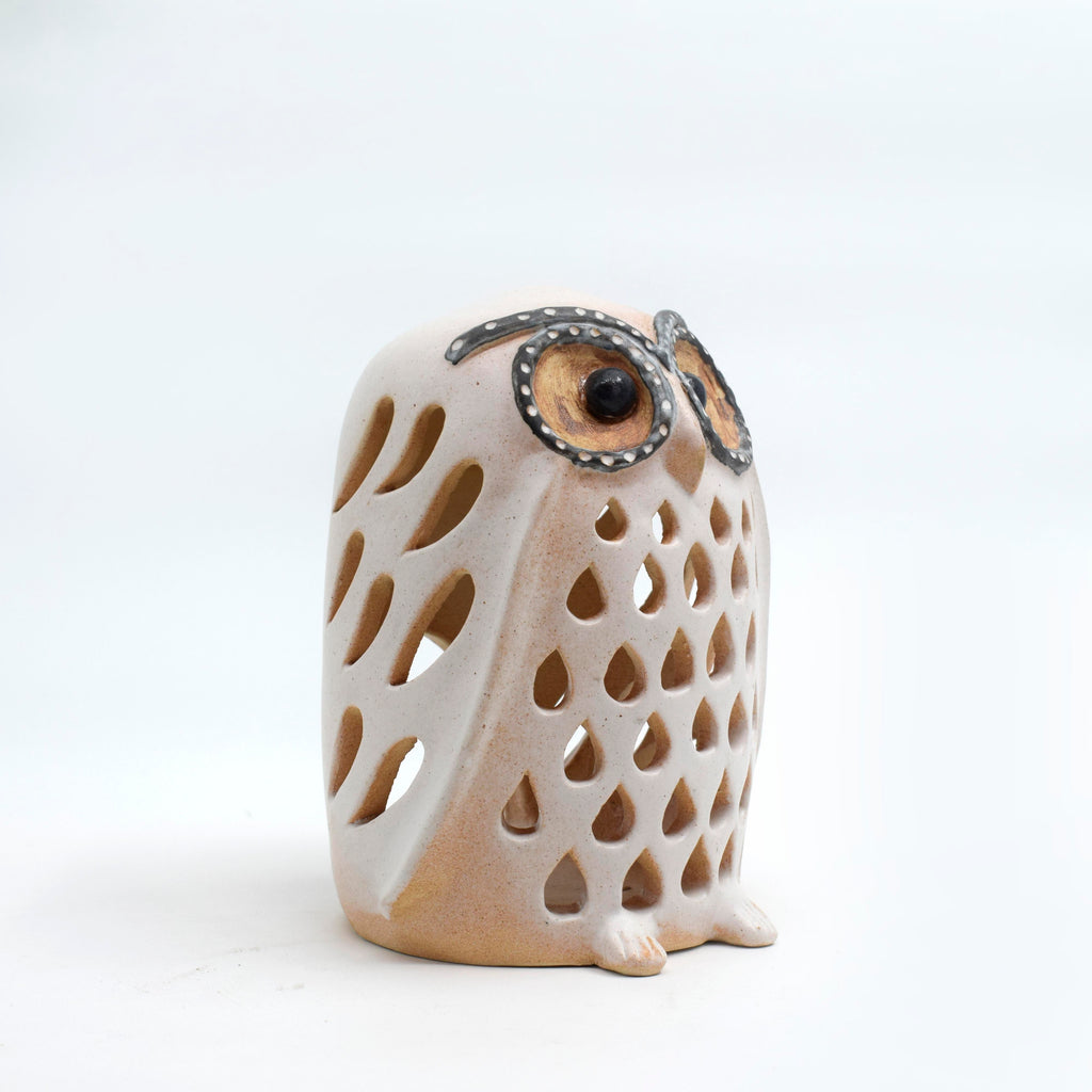 This owl candle holder features intricate cutwork, making it a uniquely beautiful tea light holder. Add a touch of charm to your home decor with this functional and ornate piece.