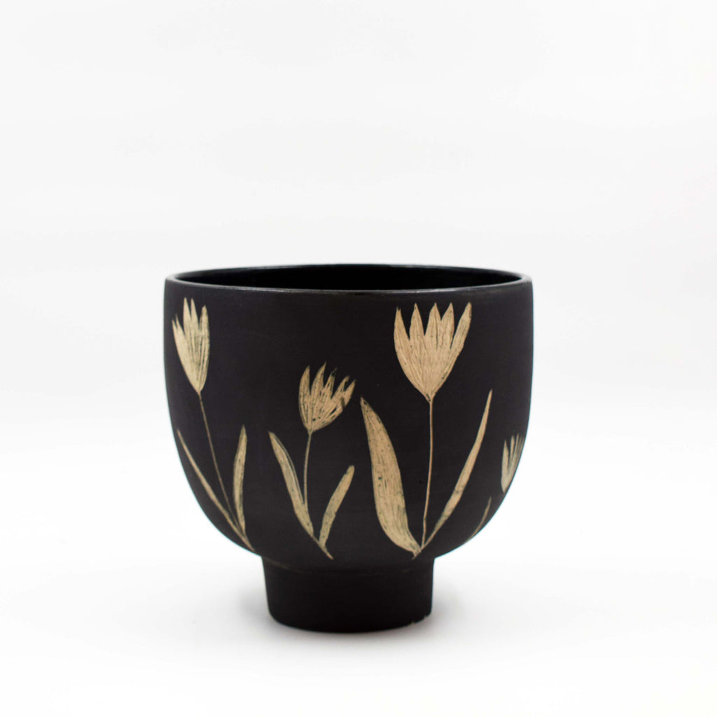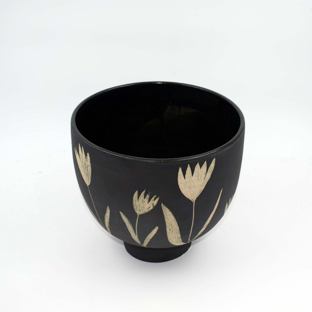 Experience the beauty of nature with our Sgraffito Lily Bowl Vase. Handmade with stoneware with a black and white lily design using the sgraffito technique, this elegant vase will add a touch of charm to any room. Its bowl shape is perfect for showcasing your favourite blooms. Bring the outdoors in with this unique and timeless piece.